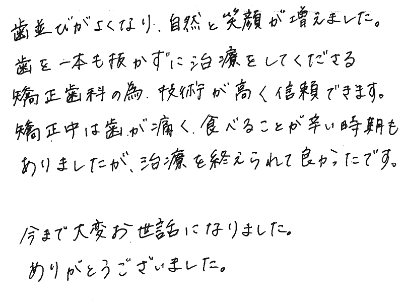 矯正中は歯が痛く、食べることが辛い時期もありましたが、治療を終えられて良かったです。