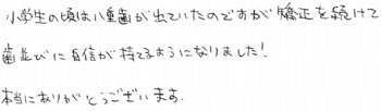 小学生の頃は八重歯が出ていたのですが、矯正を続けて歯並びに自信が持てるようになりました! 本当にありがとうございます。