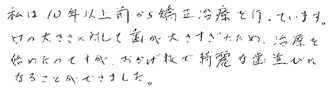 私は10年以上前から矯正治療を行っています。口の大きさに対して歯が大きすぎたため、治療を始めたのですが、おかげ様で綺麗な歯並びになることができました。